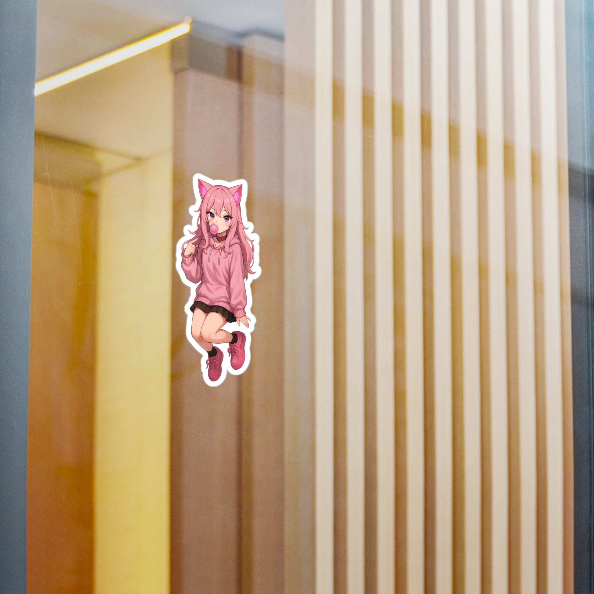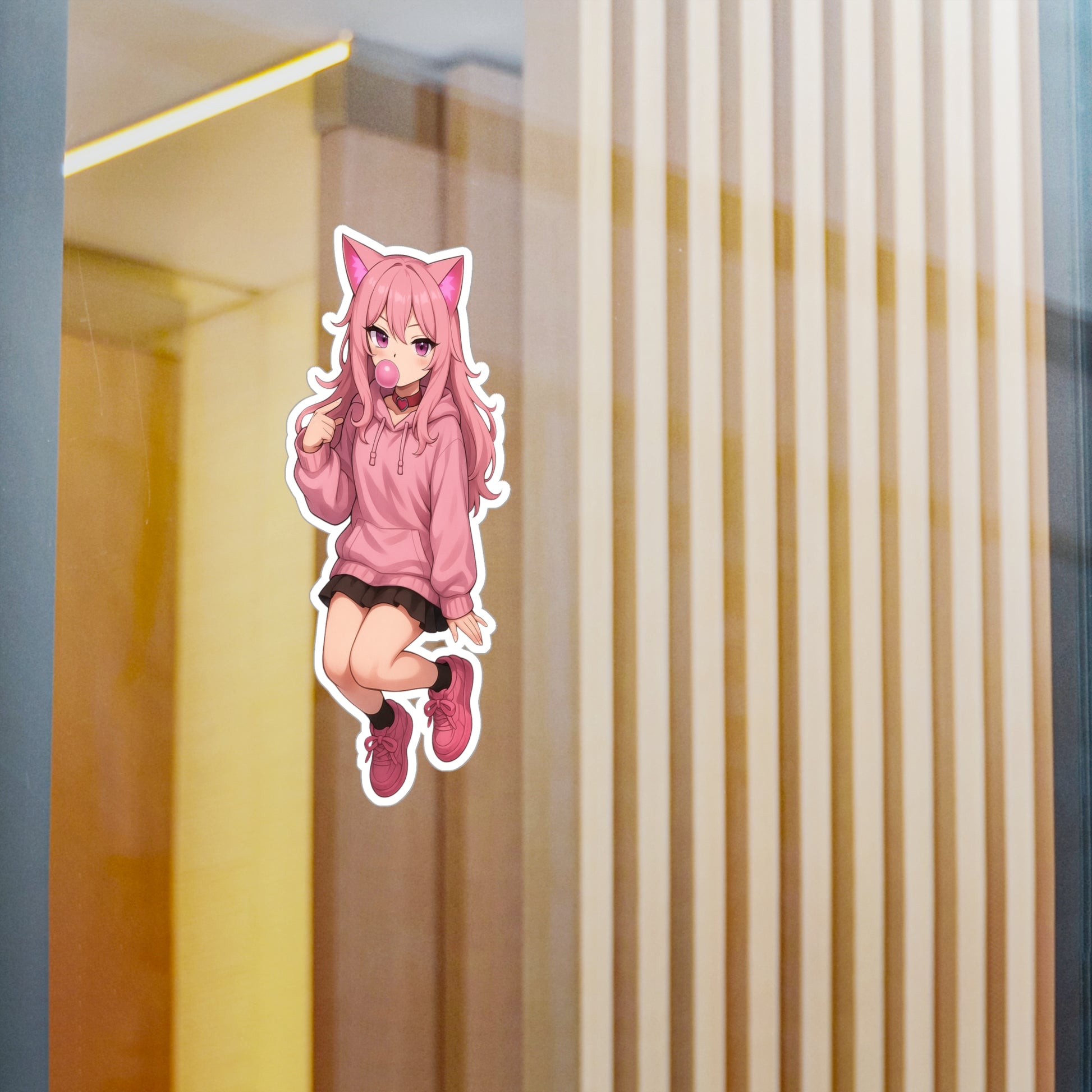 Bring playful anime energy to your space with this Thread No Sekai sticker, featuring our stylish pink-haired cat girl blowing bubblegum with attitude. Made from 100% durable vinyl with a strong adhesive, it’s built for long-lasting indoor decoration.