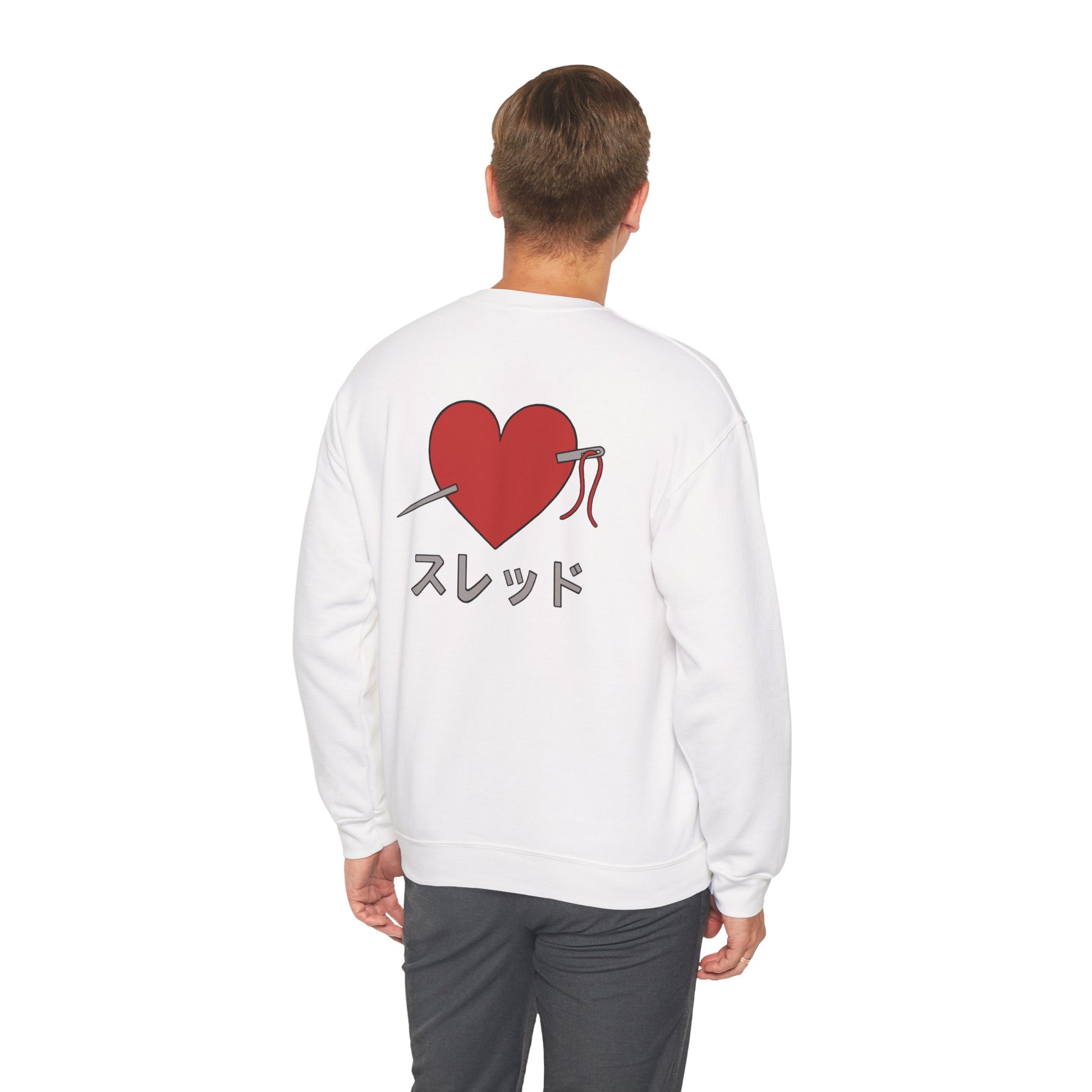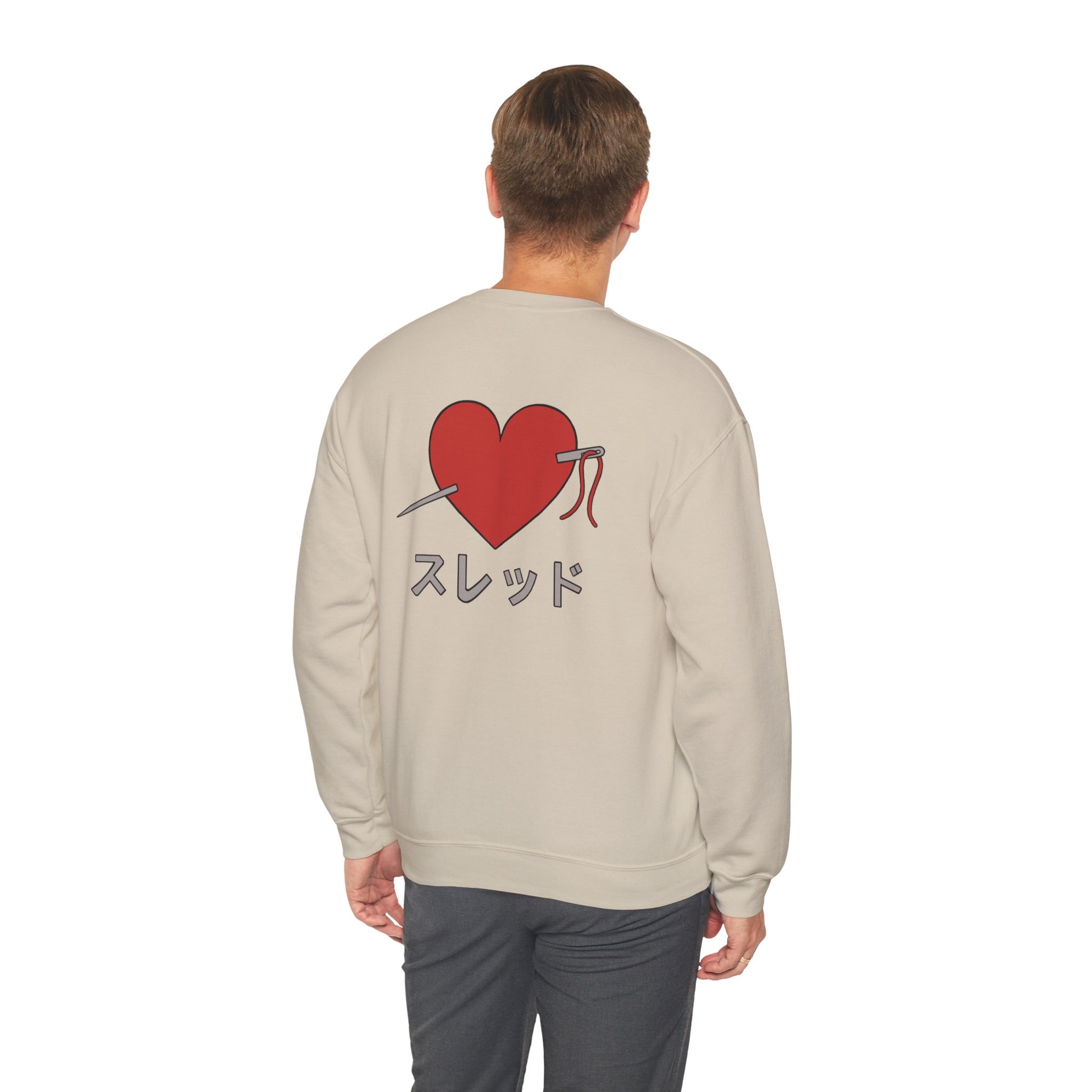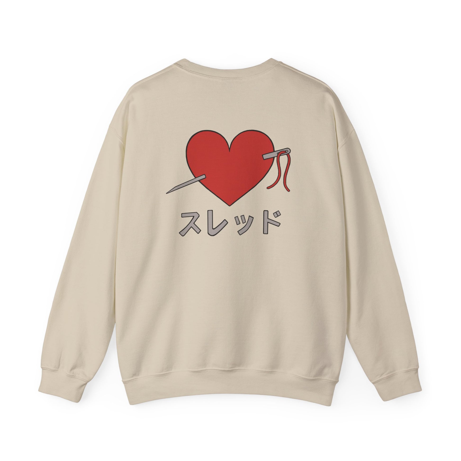 This original Thread No Sekai sweatshirt features a cozy, high-quality piece that blends streetwear with minimalist, meaningful design. The back showcases a bold red heart being stitched by a silver needle with red thread, paired with Japanese text reading “スレッド” (“Thread”). Simple yet striking, it symbolizes care, craftsmanship, and connection.
