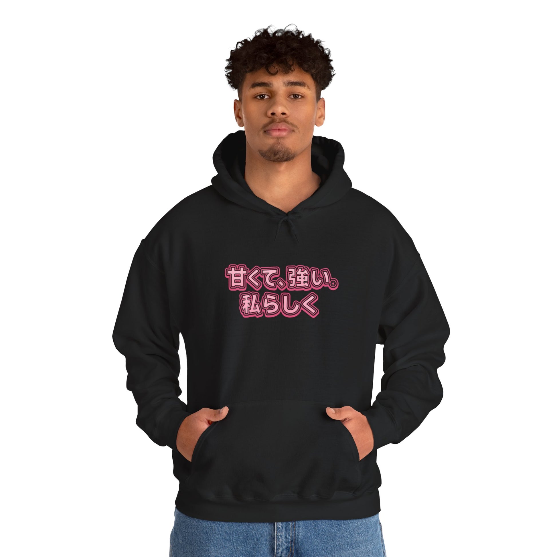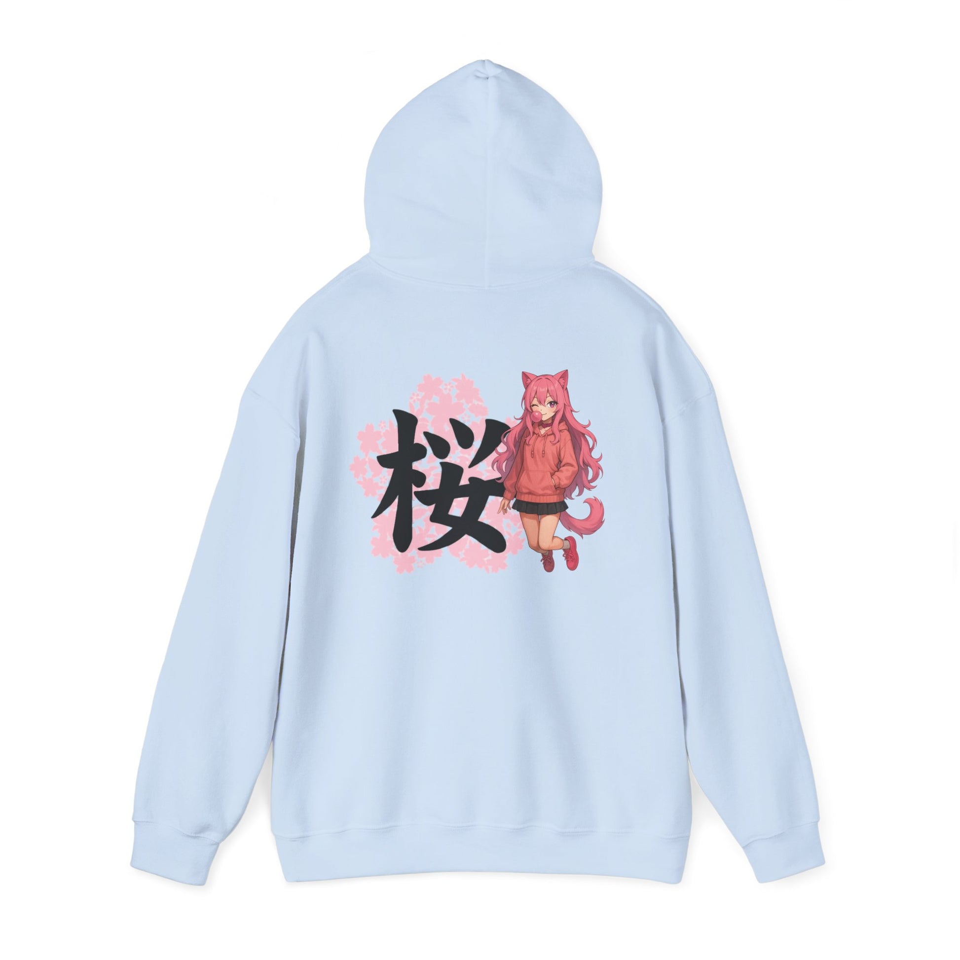 This original Thread No Sekai hoodie features a cozy, high-quality piece that blends streetwear with soft yet powerful anime-inspired charm. The front is printed with pastel pink Japanese text reading “甘くて、強い。私らしく” (“Sweet, strong, and true to myself”), while the back showcases a pink-haired catgirl in a matching hoodie standing beside the bold kanji “桜” (“Sakura”), framed by cherry blossom petals. The design celebrates confidence, individuality, and beauty in full bloom.