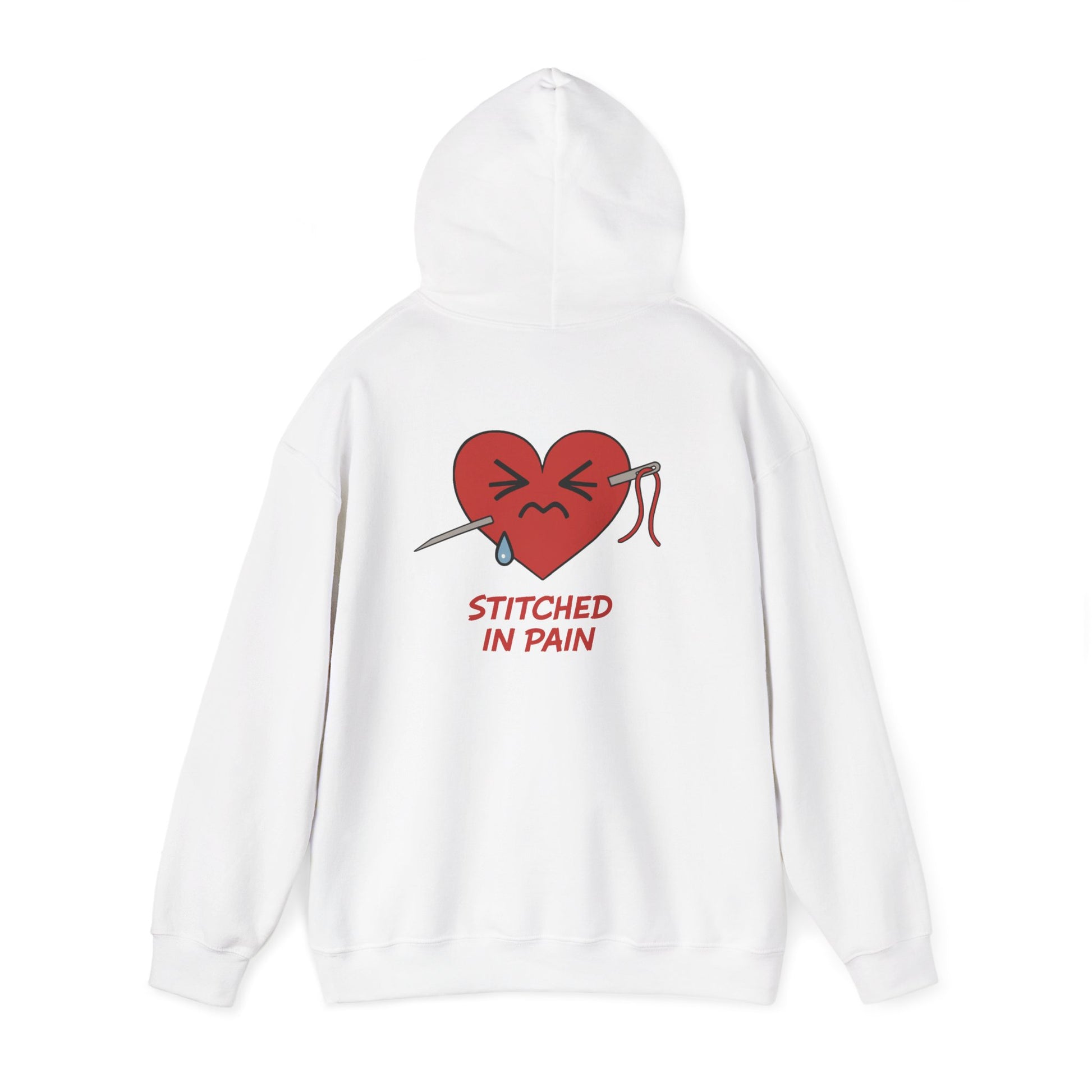 This original Thread No Sekai hoodie features a cozy, high-quality piece that blends streetwear with soft yet powerful anime-inspired emotion. The front displays a small crying heart pierced by needle and thread, while the back showcases the same heart shedding a tear above the bold phrase “Stitched in Pain.” The design symbolizes heartbreak, resilience, and raw feeling.
